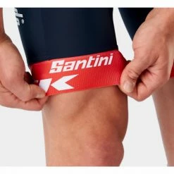 Tenue officielle de l’Ă©quipe fabriquĂ©e par Santini arborant fièrement le logo de l’Ă©quipe Trek-Segafredo.