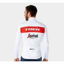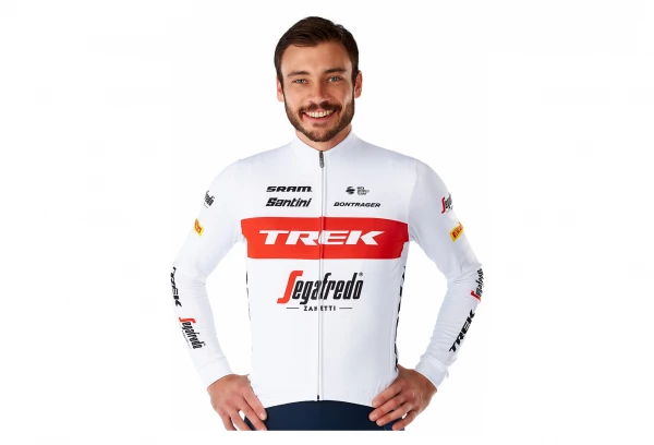 Tenue officielle de l’Ă©quipe fabriquĂ©e par Santini arborant fièrement le logo de l’Ă©quipe Trek-Segafredo.