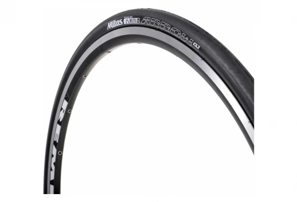 Le pneu Mitas Arrow dispose de la technologie WELTEX +, un tissu haute densité qui vient renforcer l’intégralité de la carcasse du pneu. L’excellente souplesse combinée à un poids contenu permet d’augmenter la durabilité et la résistance à la crevaison. Le ARROW ne pèse que 250g en version 25 et utilise l’excellente gomme SMC (Silica Medium Compound), une formulation spéciale contenant de la silice activée. Il est conçu pour une utilisation sportive avec des performances de haut niveau dans toutes les conditions, y compris sur le mouillé et les basses températures.