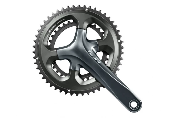 Le pĂ©dalier Ă 4 branches asymĂ©triques hĂ©ritĂ© du Dura-Ace Ă©quipe le nouveau Tiagra. L’Ă©toile du pĂ©dalier peut recevoir toutes les dentures de plateaux.