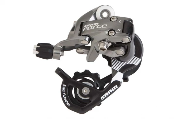 Le dérailleur arrière SRAM Force tire tous les avantages de l’Exact Actuation™, un ratio d’activation qui offre des changements précis de 3 mm à chaque passage de vitesse ainsi qu’une gamme de réglage la plus vaste possible offrant les meilleures performances d’une transmission 10 vitesses. Il est fabriqué avec des matériaux haut de gamme, la chape extérieure est en fibre de carbone et le parallélogramme interne en magnésium, offrant un poids incroyablement léger de 178 g.